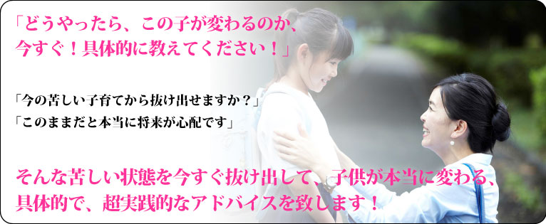 子育て心理学の電話相談 子育て心理学協会の【子育て電話相談】 【子育て電話相談】であなたが得られるものは… 子どもの不適切な行動が減る 辛い親子関係から抜け出せる お母さんのイライラが減り、怒る回数が激減する お母さん自身の子育ての軸ができて、子育て・将来に安心できる 【子育て電話相談】はこんな方にオススメです… 小学生6年生までのお子様(東の子育て相談は、中学生〜大学生までお受けしております。) 子どもの反抗が激しい、荒れているなど、手が掛かる 不登校、行き渋りがある 発達の偏り、凸凹がある